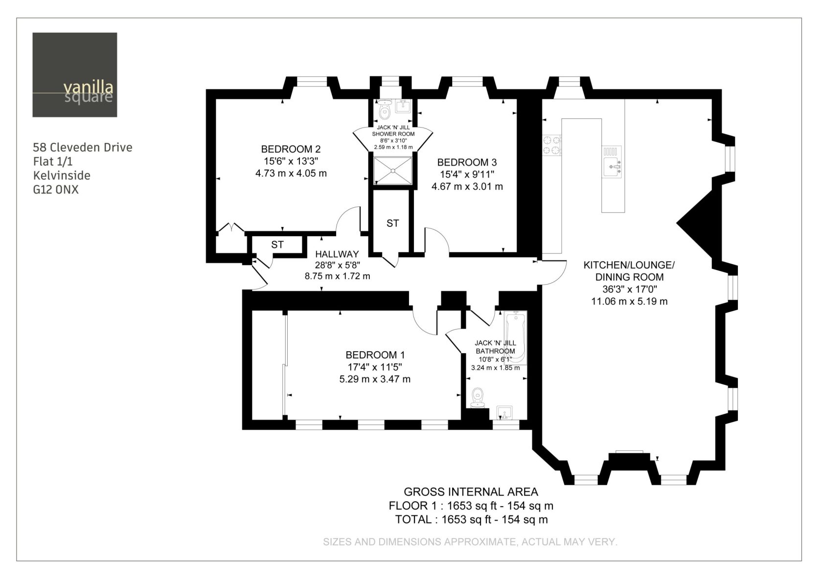 The internal accommodation comprises; welcoming entrance hallway with two storage cupboard off. An immediately impressive open plan living space extending to over 36’ and enjoying tripe aspects along with South facing windows that flood the room with natural light throughout the day. This huge living space can offer several areas for casual sitting, formal diming and even a home office area. There is a feature gas fireplace in the lounge. The kitchen is fitted with quality high gloss wall and floor units, integrated appliances and stone worktops. The principle bedroom has fitted wardrobes and access to a Jack n Jill bathroom with fresh three piece suite and over-bath shower. There are two further well proportioned double bedrooms (the second bedroom has fitted storage. Bedroom 2 and 3 are served by a beautiful Jack n Jill en-suite shower room with three piece suite including double shower cubicle.