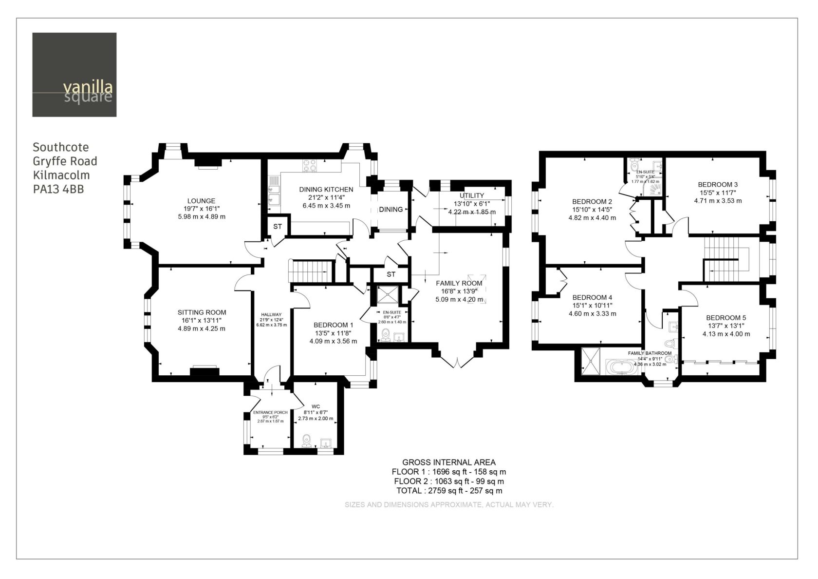 The internal accommodation comprises; entrance vestibule with wc/cloaks off, broad and welcoming entrance hallway with two storage cupboards off, impressive formal lounge with feature open fireplace and bay window to front, a sitting room with feature fireplace and three large windows that flood the room with natural light throughout the day. There is a stunning refitted kitchen with bespoken wooden wall and floor units, integrated appliances, stone worktops and plenty of space for a dining table and chairs. The extension offers versatile use and provides a valuable extra living space with direct access to the rear gardens. There is a spacious double bedroom with en-suite shower room on the ground floor, and completing the lower level is a utility room with fitted wall and floor units and plumbing for appliances.