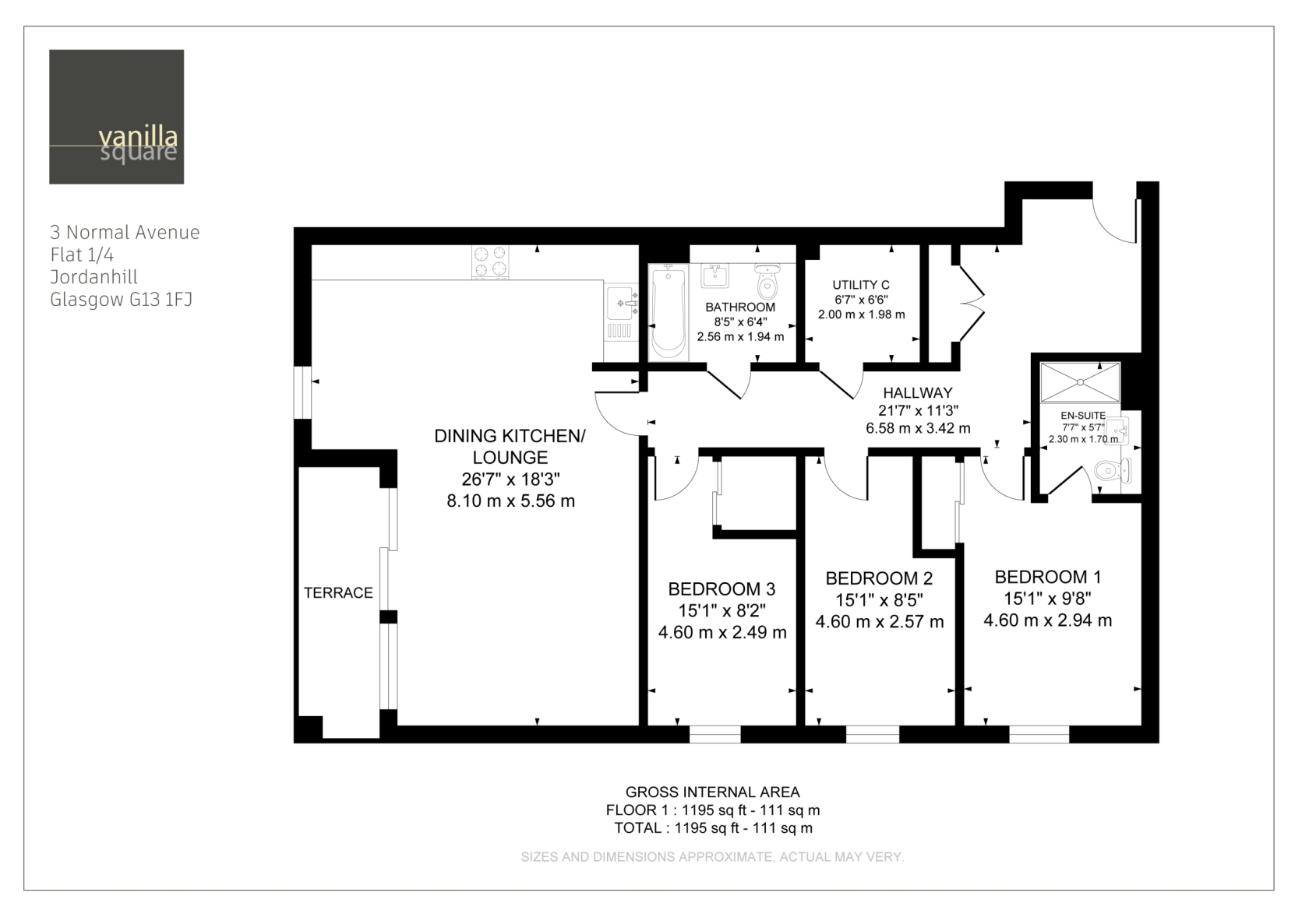 The internal accommodation comprises; broad and welcoming entrance hallway with storage cupboard off, immediately impressive 26’7 L-shaped lounge/ dining kitchen with dual aspects. The kitchen is fitted with quality wall and floor units, integrated appliances and there is plenty of space for a dining table and chairs. The open plan sitting area makes a great space for relaxing after a long day or for entertaining guests. There are patio doors opening onto the private balcony. The principal bedroom has an en-suite shower room as well as fitted wardrobes. There are two further well proportioned double bedrooms (both have fitted wardrobes), and a bathroom with fresh white three piece suite and over-bath shower. Completing the accommodation is a useful utility room with plumbing for appliances.
